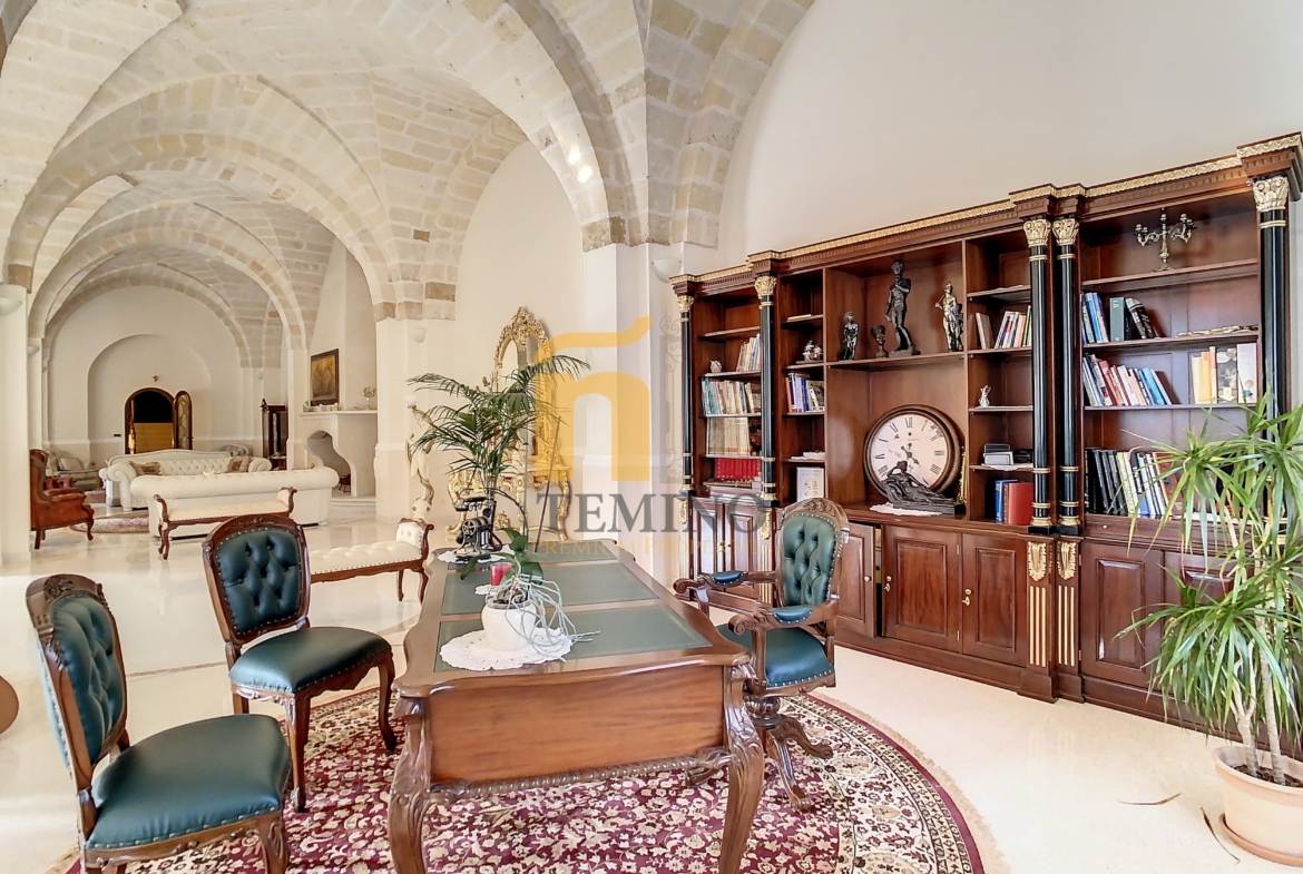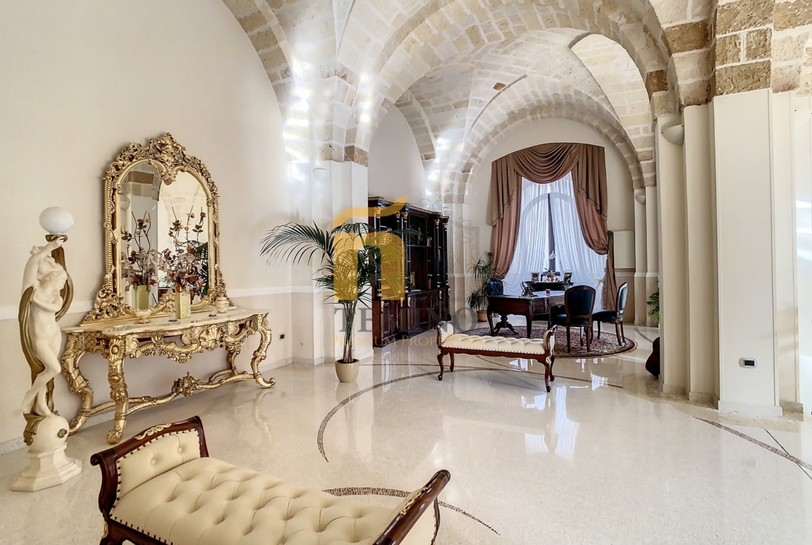 L’immobile originariamente era un oleificio storico che una volta acquistato è stato ampliato con un seminterrato un piano rialzato e un attico. L’ingresso principale ti accoglie in un spazio ampio e sontuoso, che emana un’atmosfera di eleganza e raffinatezza. Al centro del salone il soffitto è voltato a stella e rivestito con la pregiata pietra del luogo, un materiale di alta qualità che dona una sensazione di prestigio all’ambiente e che cattura immediatamente l’attenzione conferendo al salone un tocco di grandiosità e maestosità.