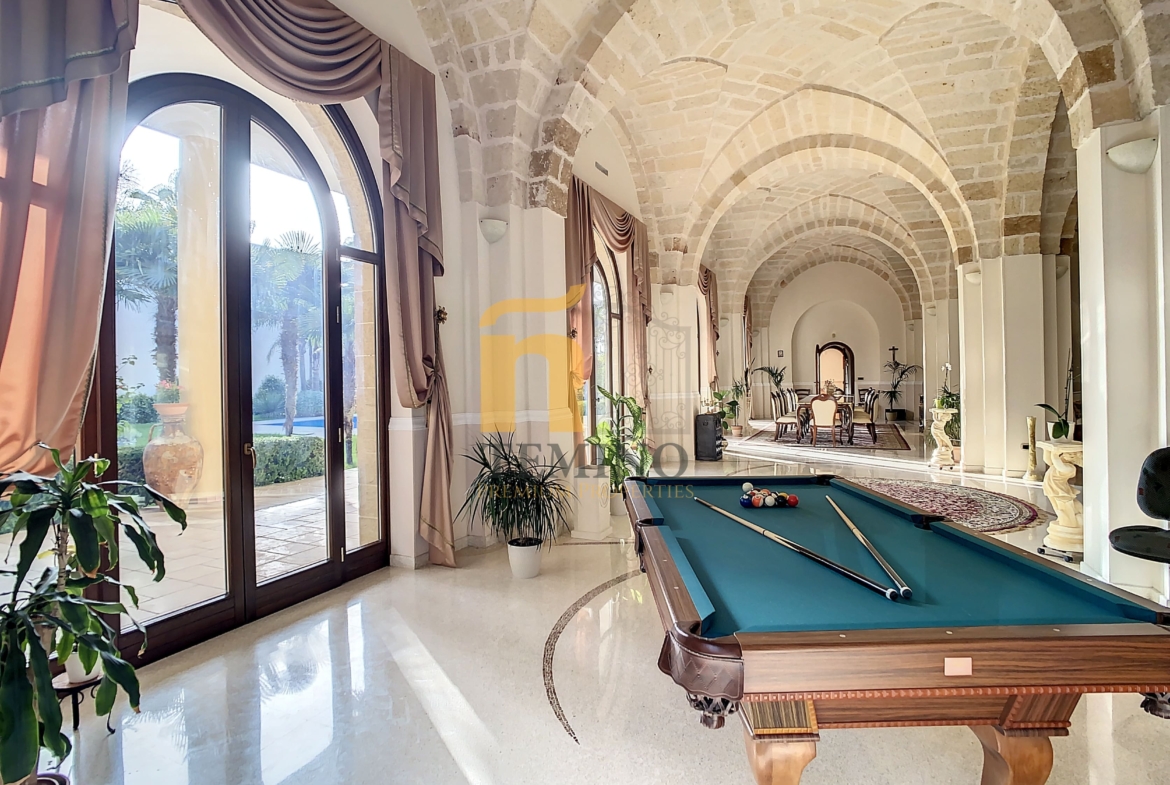 L’illuminazione del salone è attentamente studiata per creare un’atmosfera suggestiva. Grandi porte finestre permettono alla luce naturale di riversarsi nell’ambiente, enfatizzando la bellezza degli arredi e dei dettagli. Durante la notte, un sistema di illuminazione accuratamente posizionato e delicato aggiunge calore e enfasi a ogni angolo del salone, creando un’atmosfera intima e accogliente. Da questo ambiente è possibile accedere direttamente a un porticato di circa 130 mq e a una veranda di circa 20 mq, entrambi affacciati sul meraviglioso giardino.