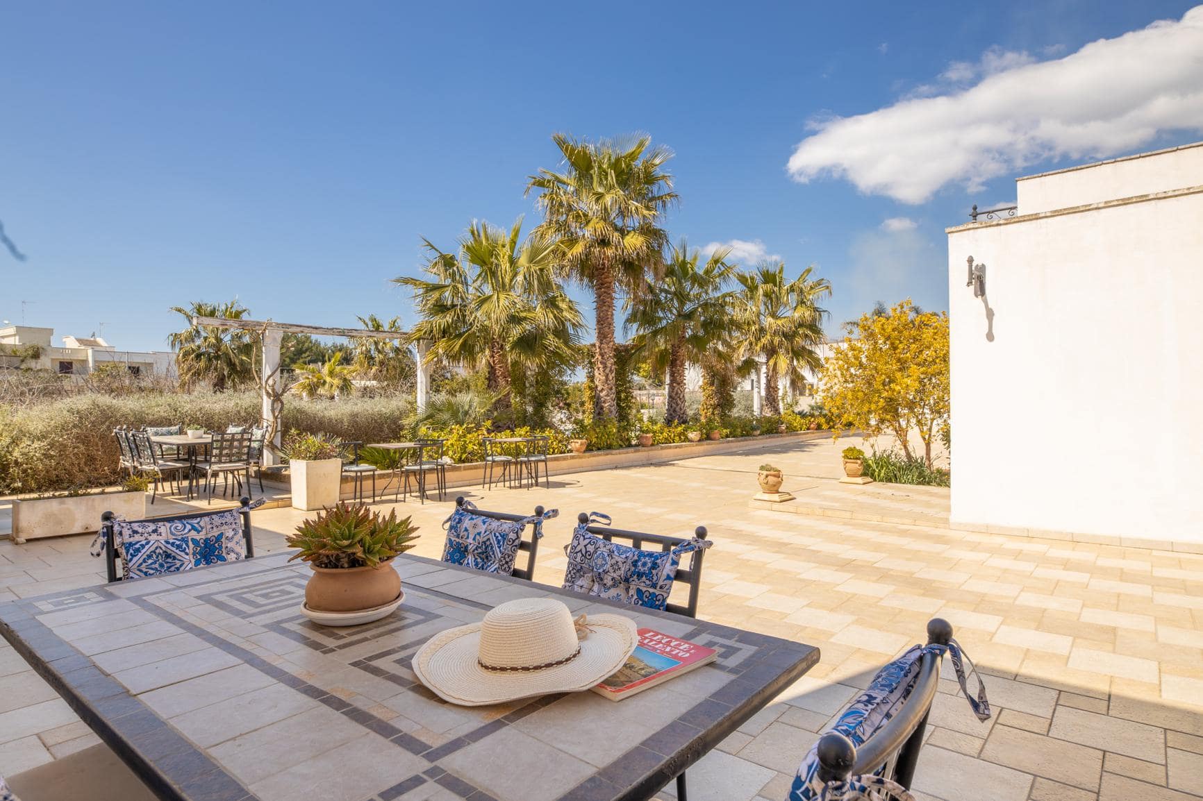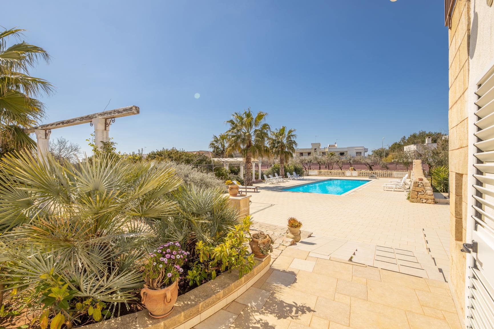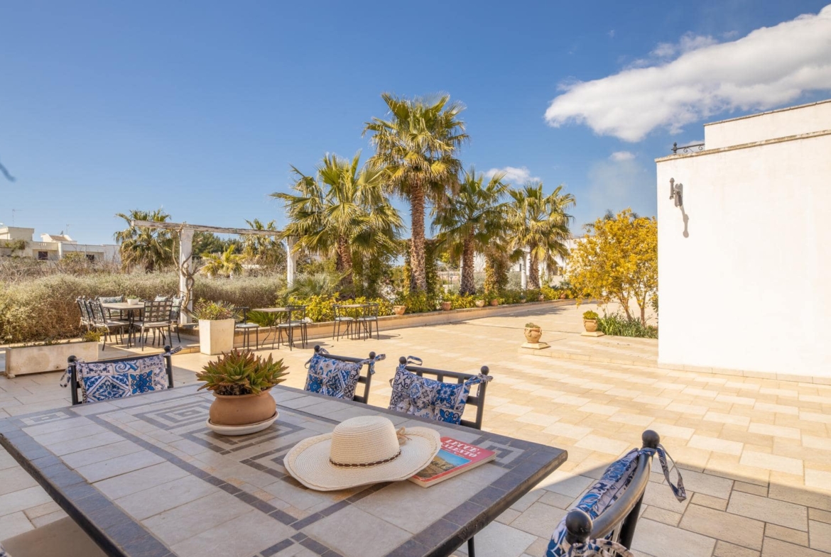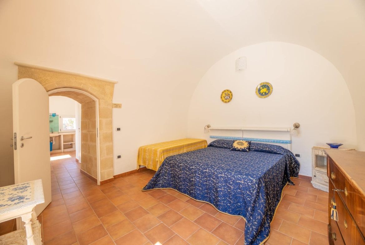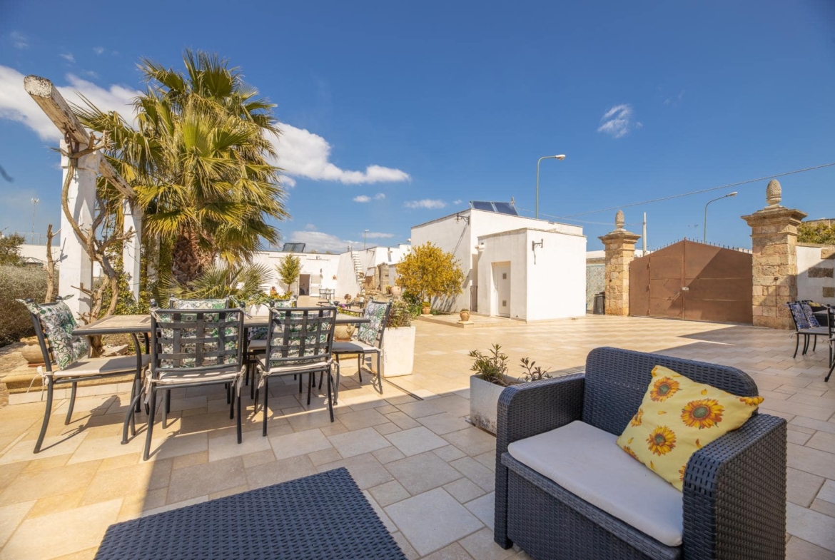 Il giardino di circa 1730 mq offre una splendida vista sulla campagna circostante e ospita diversi alberi da frutto, tra cui ulivi secolari. I turisti possono godersi il loro soggiorno all’aperto in due gazebo in muratura, perfetti per rilassarsi e socializzare con gli amici e la famiglia. Per rinfrescarsi durante i caldi mesi estivi, invece, la masseria dispone anche di una meravigliosa piscina (15x5x1,70m) piastrellata in mosaico e gradini in pietra, dove gli ospiti possono rilassarsi e godersi il sole in totale privacy.