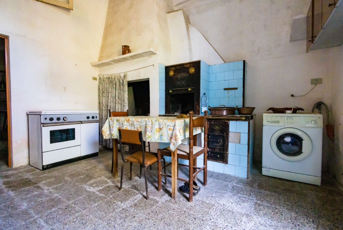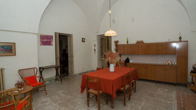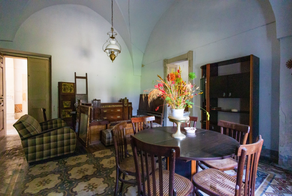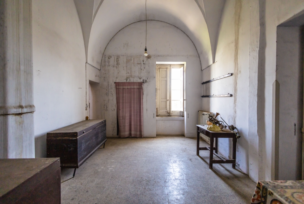 Attraverso la navata centrale dell’importante facciata arricchita da effigi e decorazioni in pietra leccese si accede all’androne di circa 70 mq voltato a botte, che dà accesso ai 2 appartamenti del piano terra, uno sul lato sinistro e l’altro sul lato destro. Sulla sinistra si presentano 3 locali, un tempo utilizzati come studio, in cui sono presenti antichi camini in pietra leccese, mentre sulla destra, troviamo un appartamento composto da 3 vani più accessori con affaccio sul rigoglioso giardino che ospita un pozzo sorgivo e una cisterna, un frutteto ed un agrumeto in produzione e alberi di magnolie. Tramite un percorso lastricato ricoperto da un pergolato di vite si accede alla conigliera e alla colombaia, antichi locali un tempo utilizzati per il ricovero degli animali.