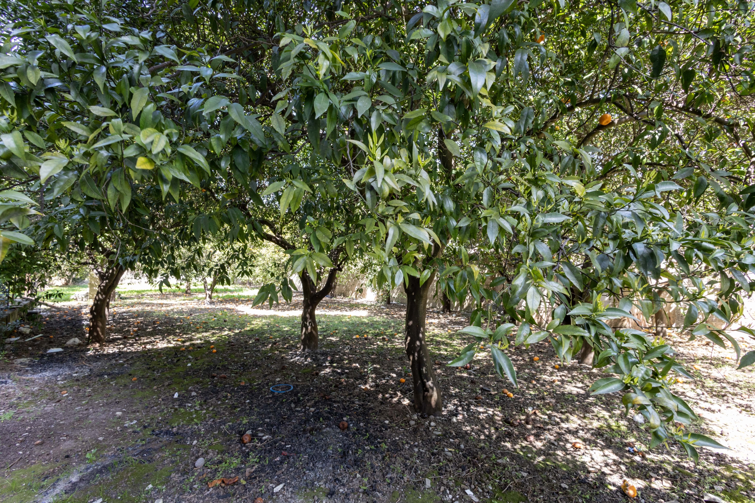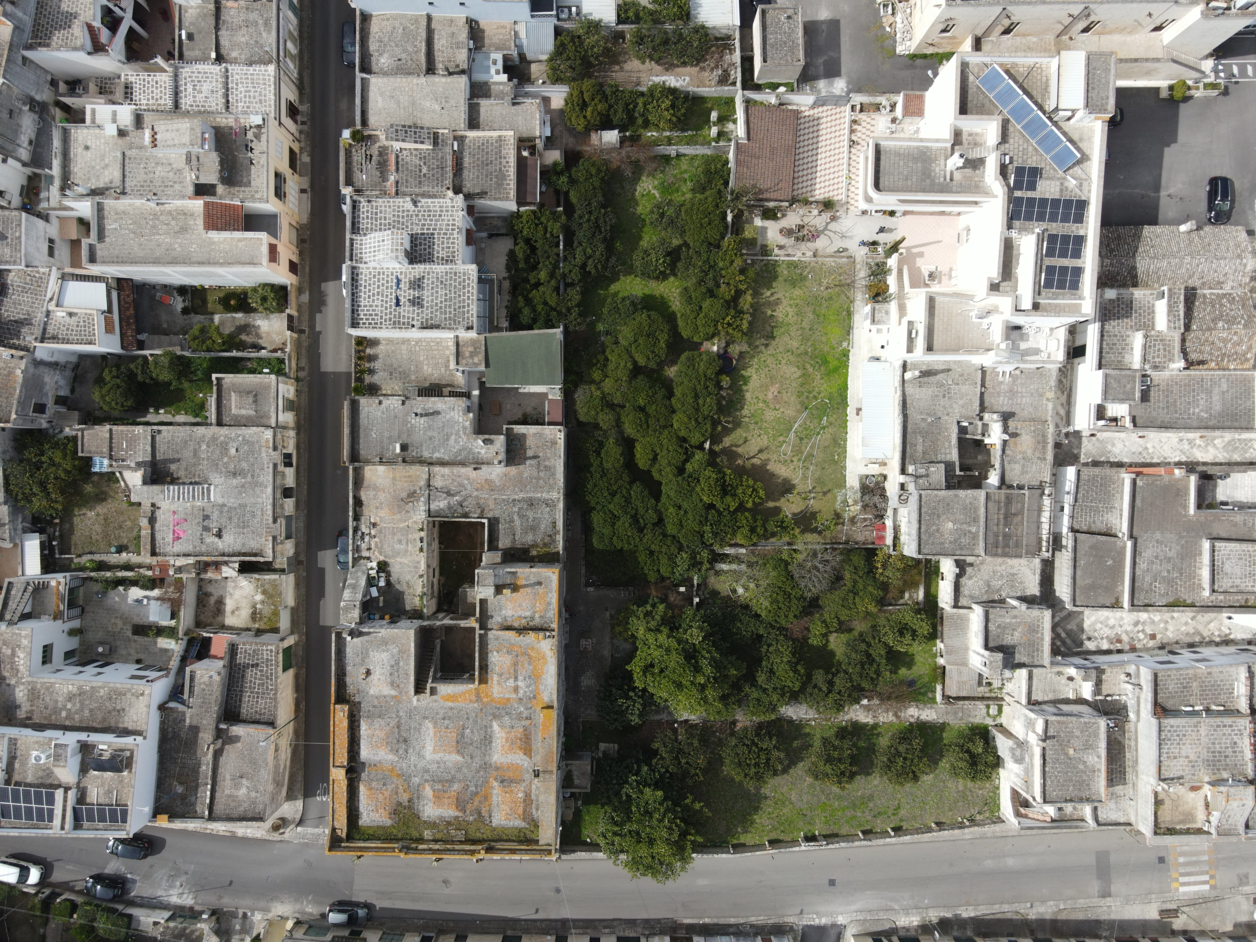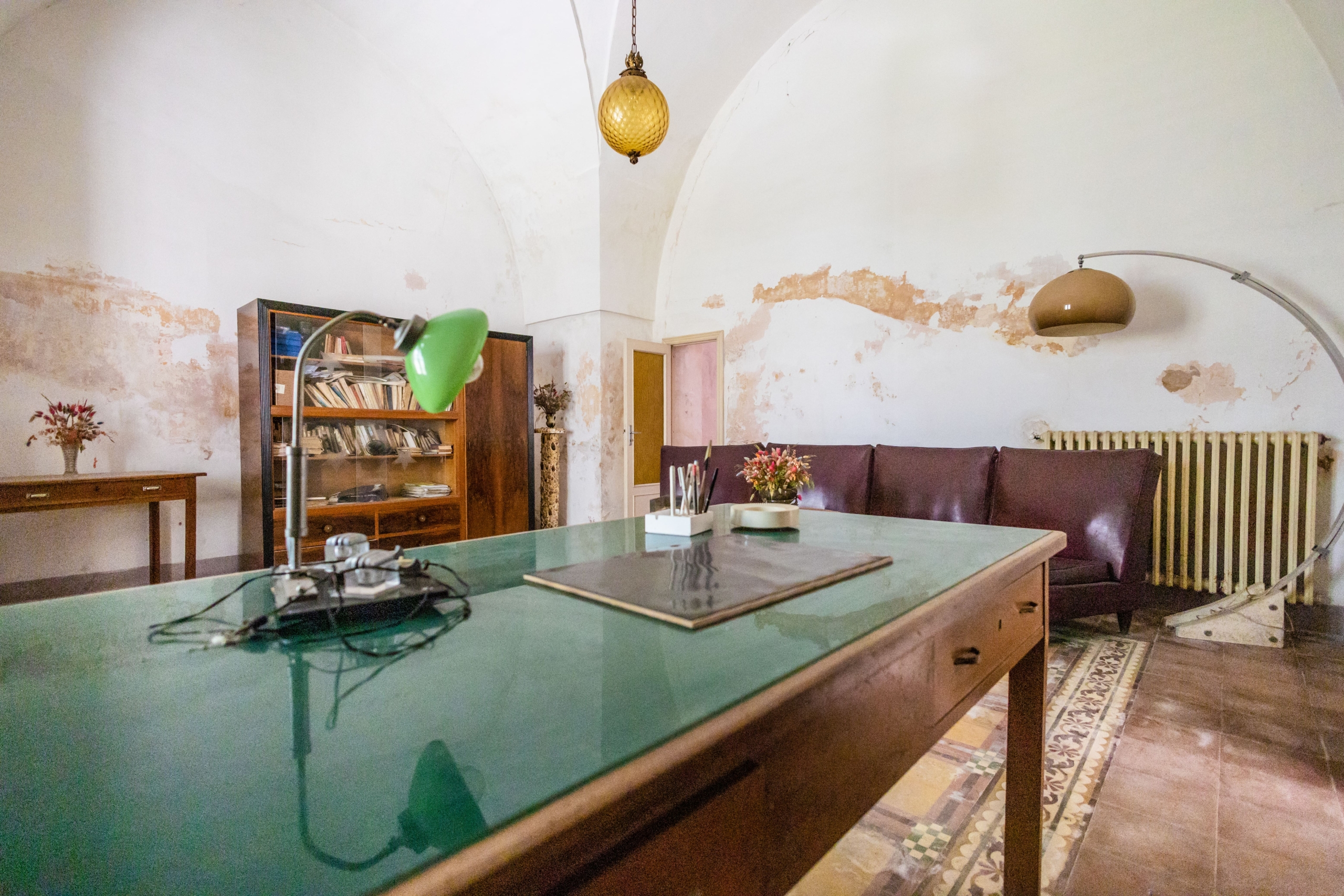 Attraverso la navata centrale dell’importante facciata arricchita da effigi e decorazioni in pietra leccese si accede all’androne di circa 70 mq voltato a botte, che dà accesso ai 2 appartamenti del piano terra, uno sul lato sinistro e l’altro sul lato destro. Sulla sinistra si presentano 3 locali, un tempo utilizzati come studio, in cui sono presenti antichi camini in pietra leccese, mentre sulla destra, troviamo un appartamento composto da 3 vani più accessori con affaccio sul rigoglioso giardino che ospita un pozzo sorgivo e una cisterna, un frutteto ed un agrumeto in produzione e alberi di magnolie. Tramite un percorso lastricato ricoperto da un pergolato di vite si accede alla conigliera e alla colombaia, antichi locali un tempo utilizzati per il ricovero degli animali.