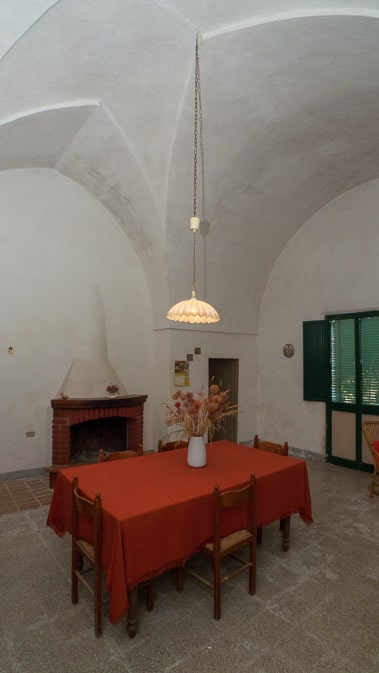 Sempre dall’androne e tramite un’ampia scalinata, si accede al piano superiore, mentre il sottoscala fa da collegamento ad una corte interna, nucleo dell’intero fabbricato, che dà accesso ai vari locali un tempo ad uso deposito e stalle, sormontati dalle tipiche volte a stella, in parte a faccia a vista ed in parte intonacate.