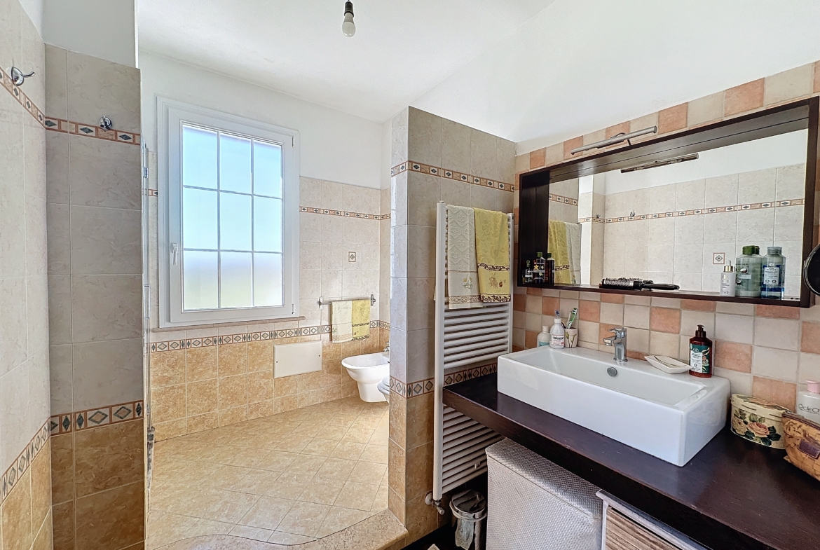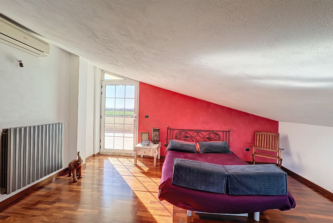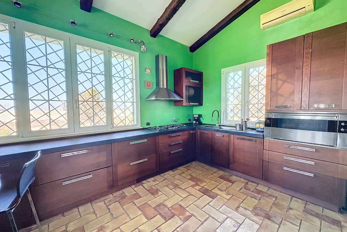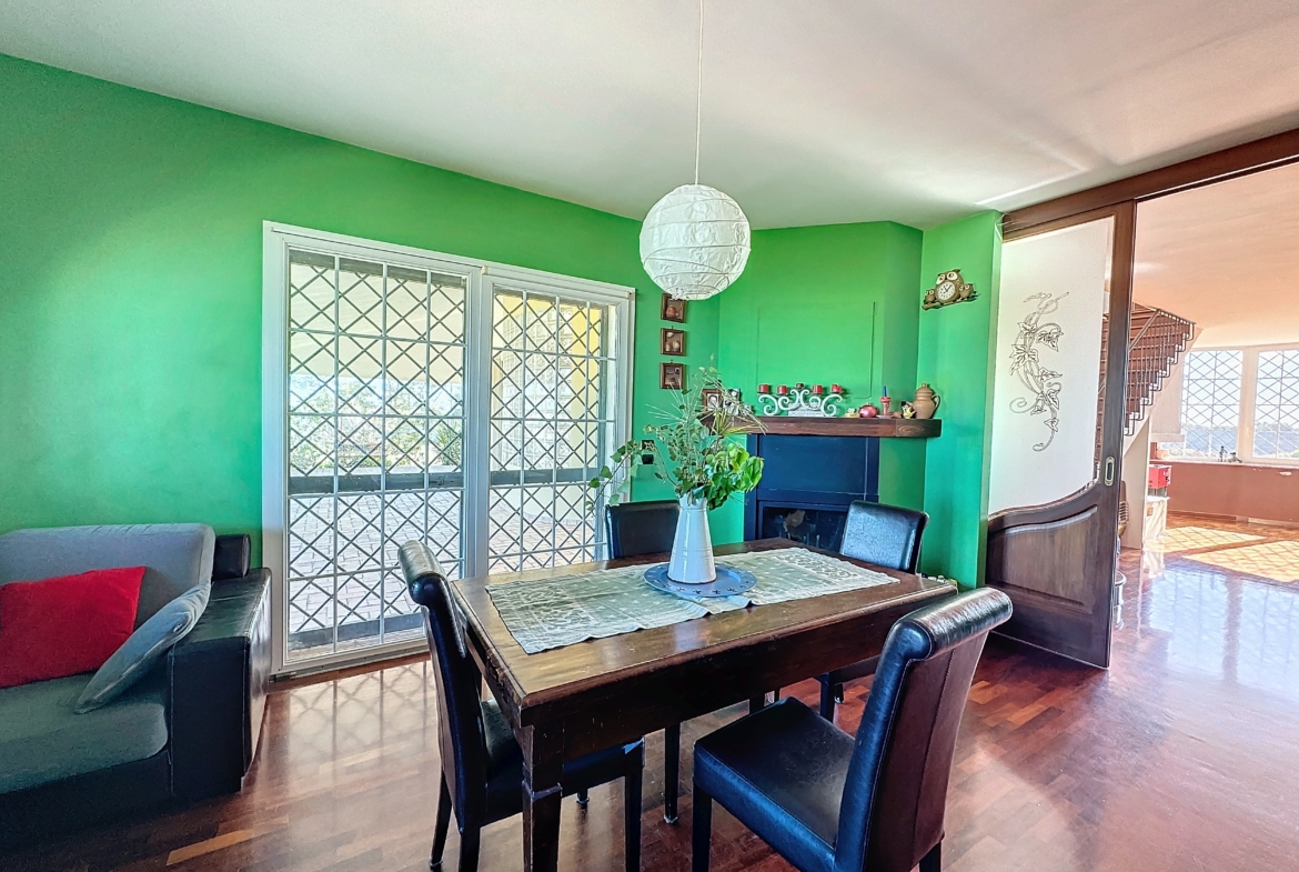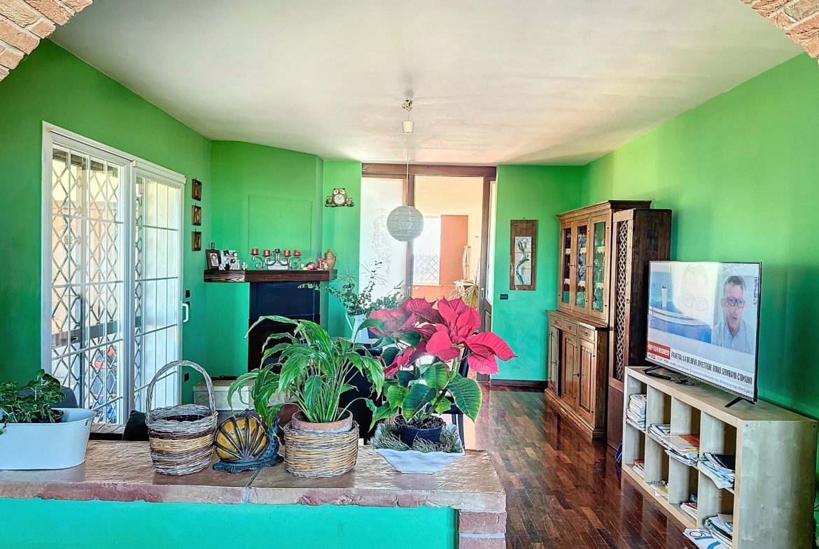 Entrando, ti ritrovi nel cuore della casa, un luminoso salone con camino ti accoglie con delle ampie vetrate che si affacciano su un terrazzo incantevole, invitandoti a godere della vista mozzafiato e a respirare l’aria pura della campagna. La cucina, moderna e funzionale, è il luogo ideale per sperimentare ricette gourmet, mentre il soggiorno offre spazio per rilassarsi e condividere momenti preziosi con famiglia e amici.