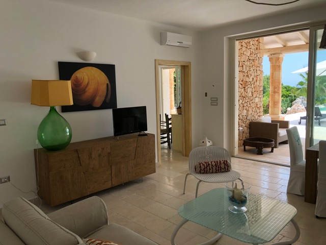 Questa incantevole villa con piscina e vista mare è valorizzata da un caratteristico rivestimento esterno in pietra, un bellissimo porticato attrezzato con eleganti mobili da giardino in rattan e un area relax con lettini prendisole a bordo della piscina scoperta di forma irregolare ricavata dal dislivello naturale del terreno, sulla parte retrostante un’area cucina/barbecue attrezzata in muratura. Comoda area parcheggio extra, di proprietà esclusiva, sulla litoranea, di fronte il cancello d’ingresso. La villa, perfettamente regolare dal punto di vista urbanistico edilizio e catastale (con certificato di agibilità), è dotata di tutti i comfort tra cui: impianto fognante, cisterna e predisposizione per l’allaccio alla rete idrica pubblica, impianto di riscaldamento, impianto di climatizzazione, pannelli solari termici, zanzariere, infissi in alluminio a taglio termico e doppia vetrocamera e impianto di allarme.